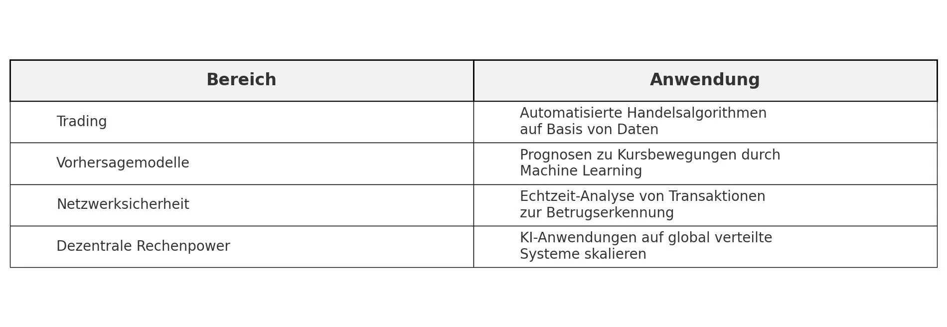 Abbildung 2: Klassische Anwendungsfelder für KI-Coins 2025 - Bereich & Anwendung